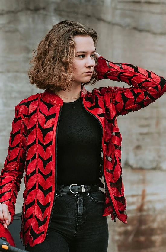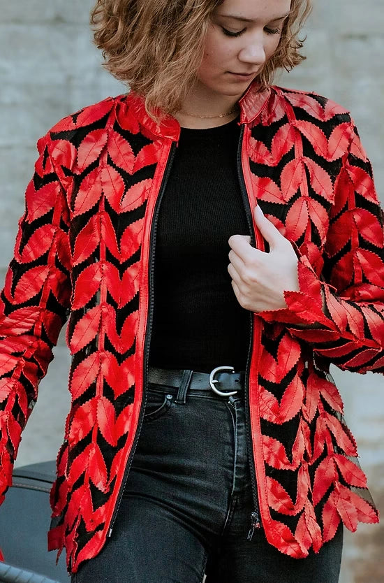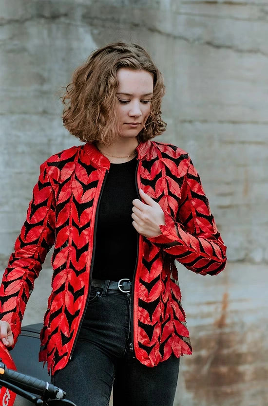 - Upper: 100% lamb leather Beautifully hand cut leaf jacket